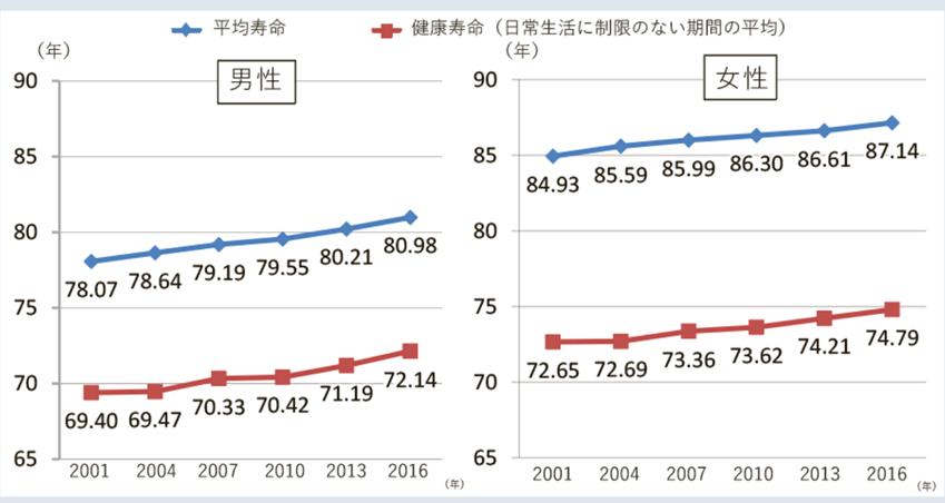 - 健康寿命は 2001年 72.65歳 → 2016年 74.79歳と約2.1歳延びています。