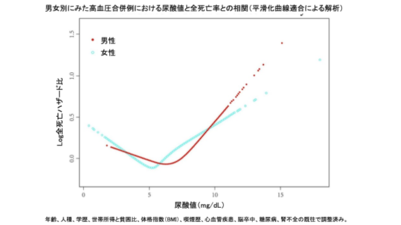 一般成人を対象にした解析でも同様にU字型の関係が示されました。- 男女とも尿酸値が低すぎても高すぎても全死亡リスクが上昇