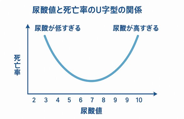 これは、尿酸値が高すぎても低すぎても死亡リスクが高まることを意味します。