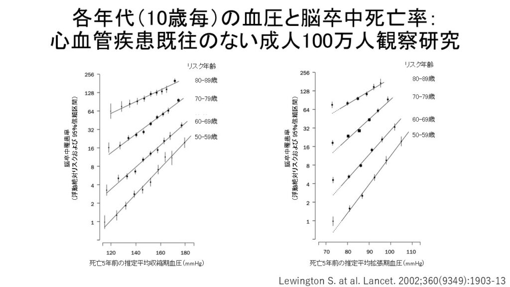 どの年代でも血圧が高くなるほど、脳卒中死亡のリスクが連続的に増えることが示されました。