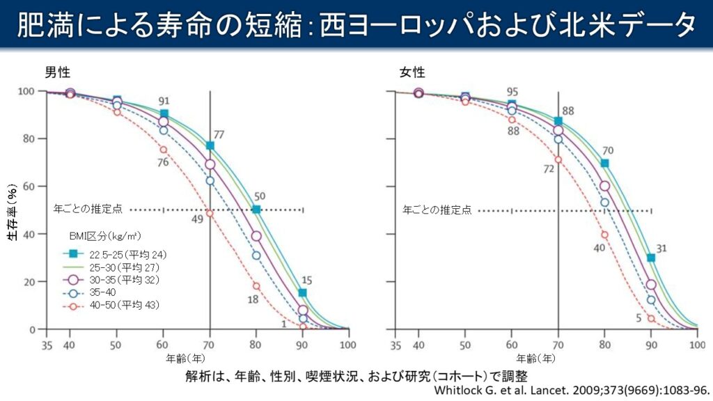 肥満に伴って起こる病気が、寿命に大きく影響することを表しています。