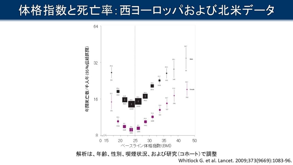 最も長生きする体格指数(BMI)は22.5〜25前後であることが示されています。