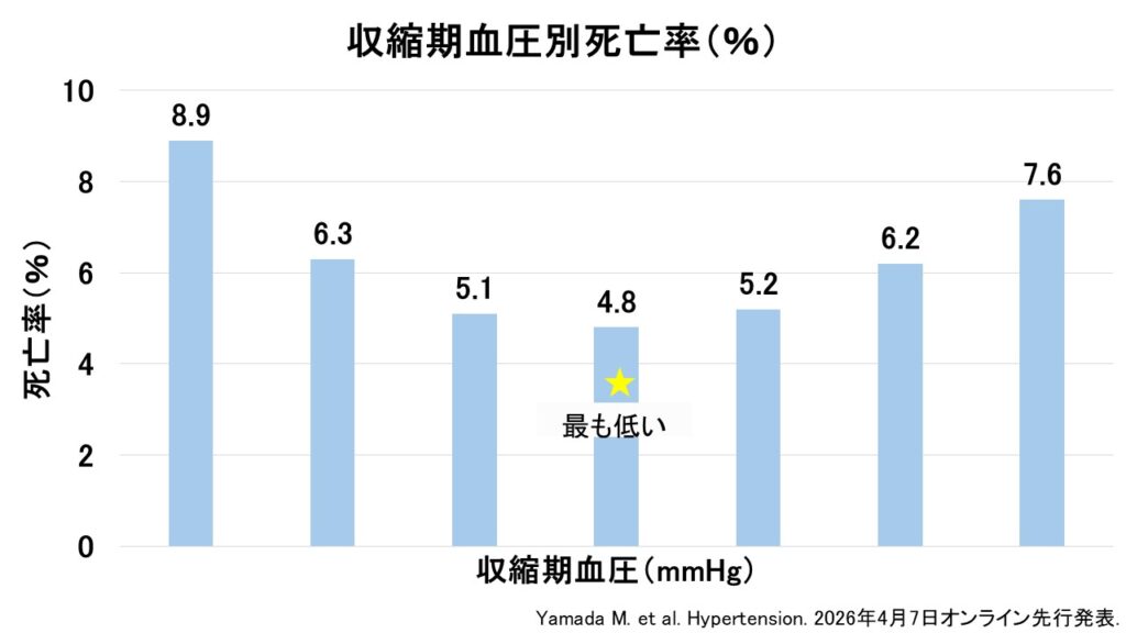 ▶ 最も死亡リスクが低かったのは、「SBP 130~139 mmHg」